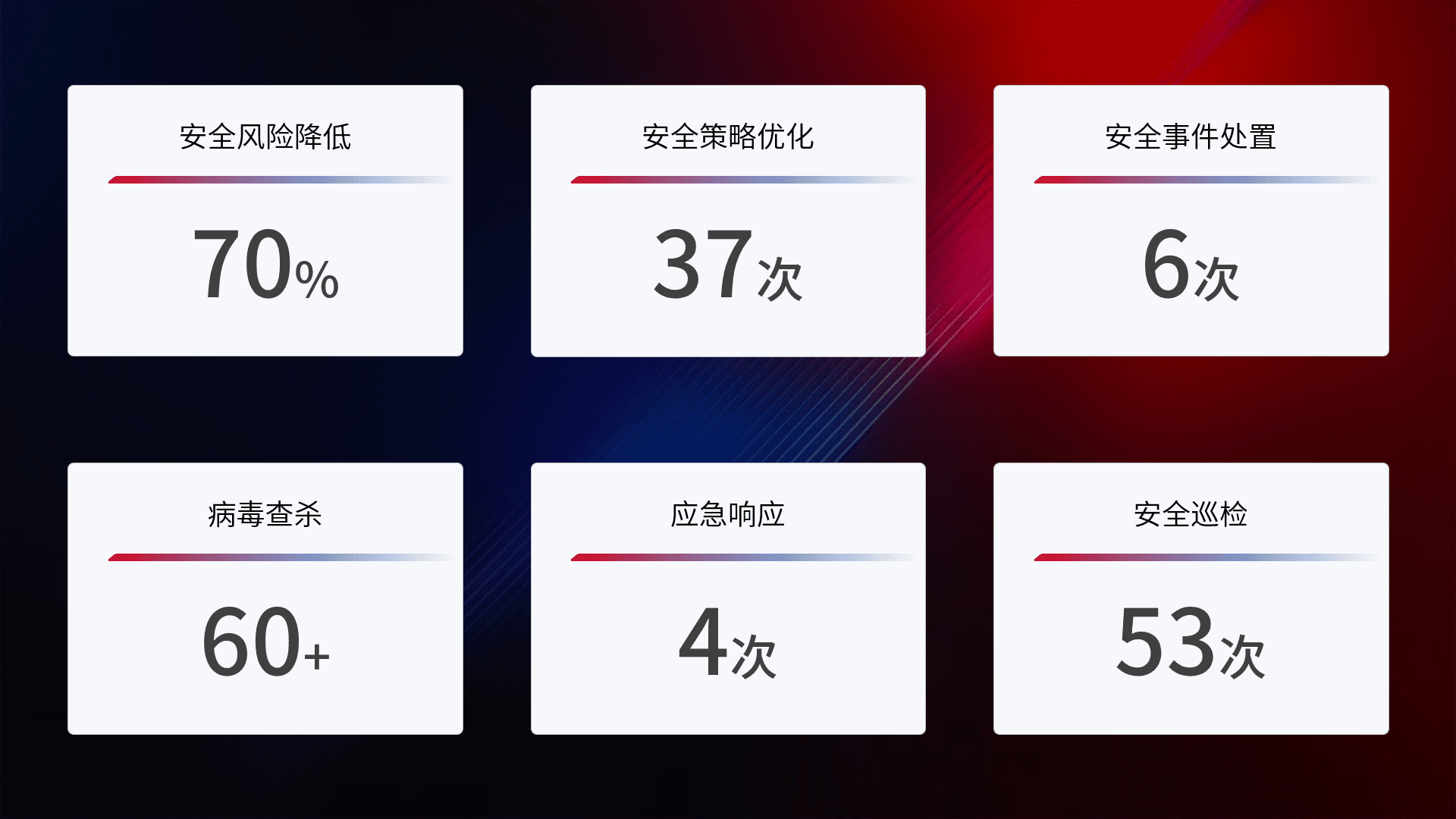 提供全面的安全事件报告体系,,,包括处置报告、、、、周报、、、、季度和年度总结,,结合持续监控,,帮助客户深入了解网络安全状况。。
